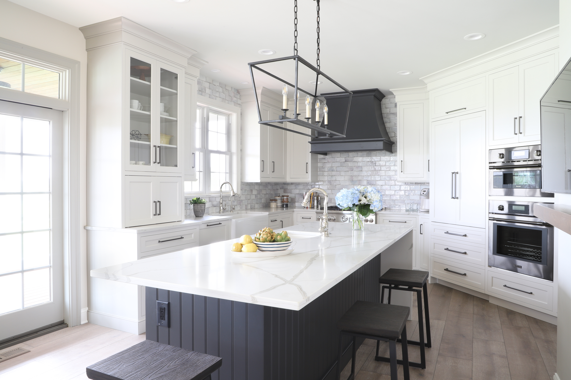 We kept this design timeless with clean white countertops, rich navy cabinetry, and stainless steel finishes and appliances.