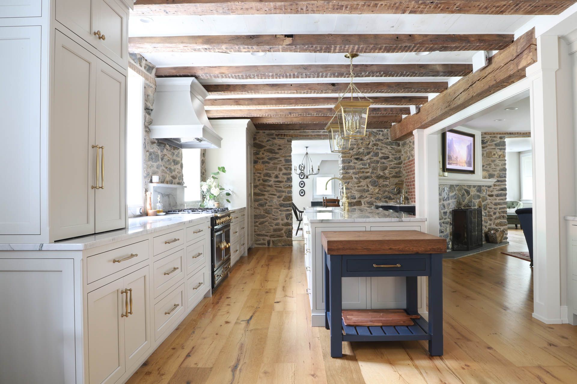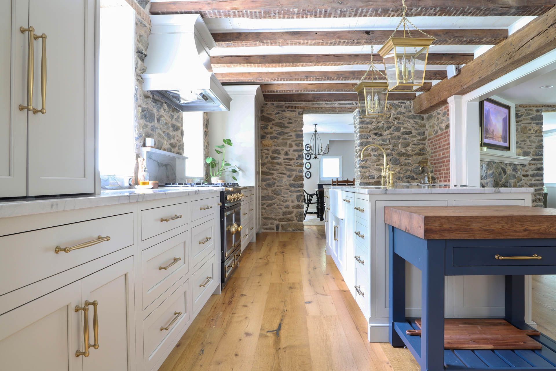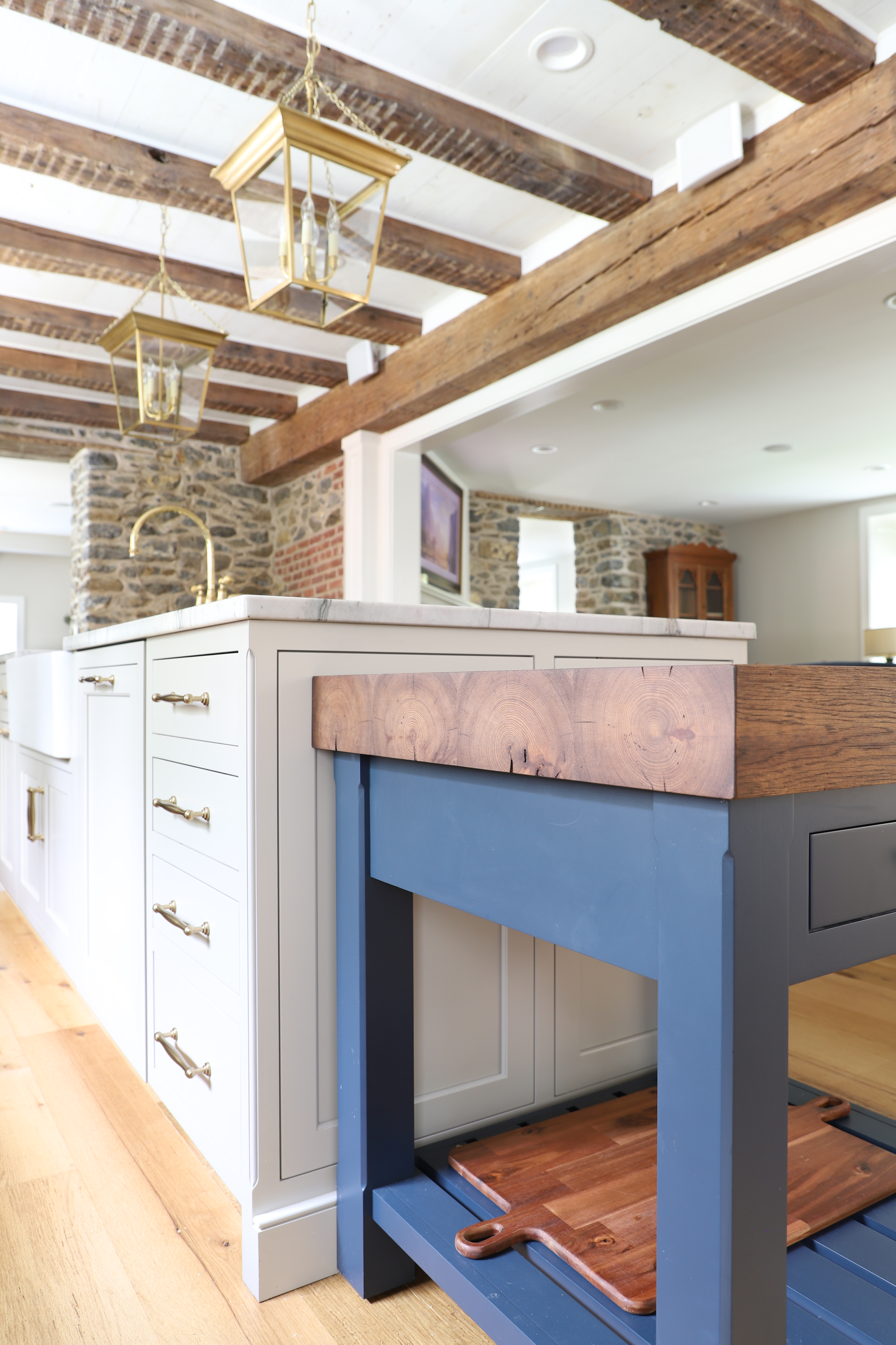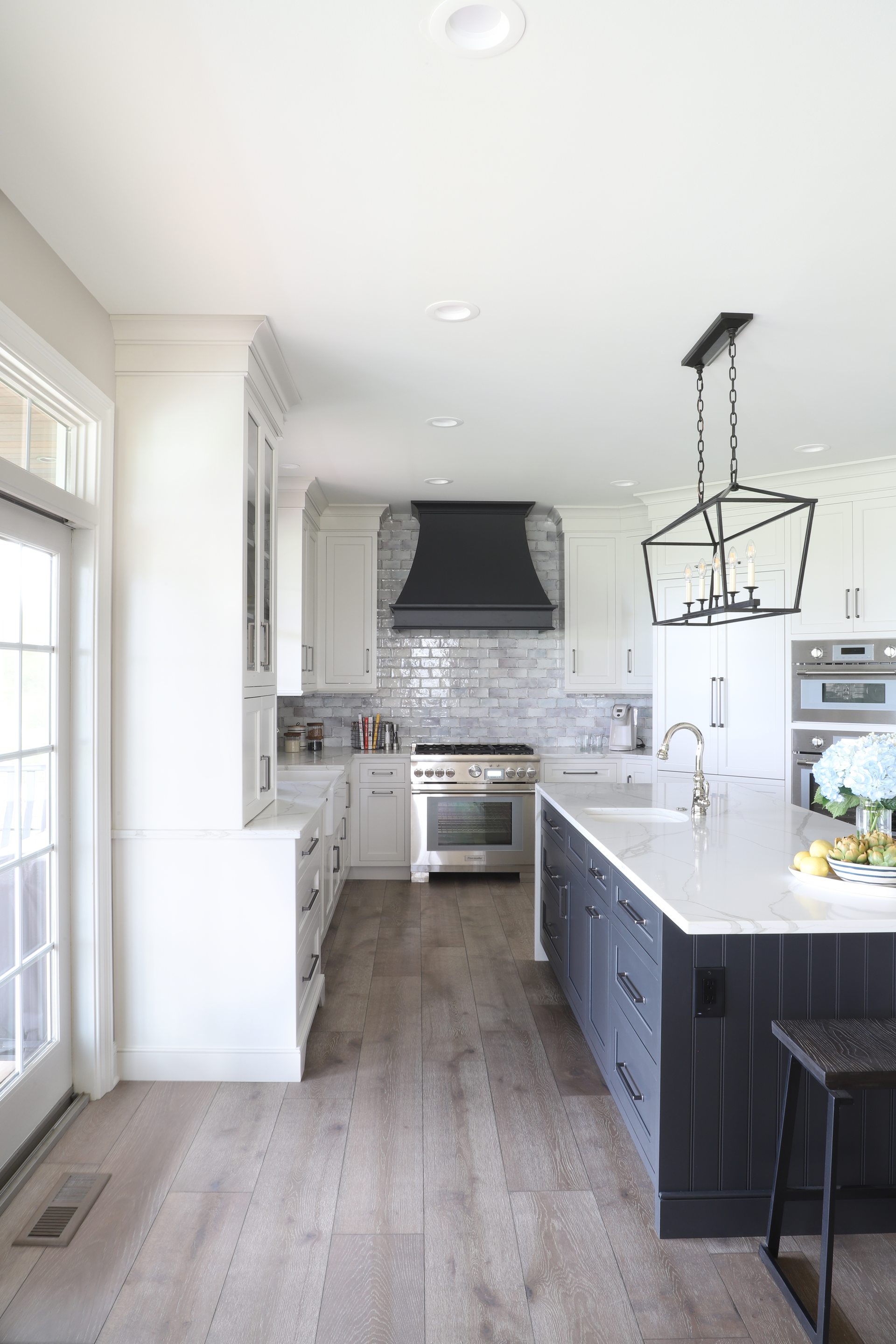 We love the balance of dark and light in this space. The handcrafted hardwood floors, custom blue-grey island, and fretwork-patterned runner rug perfectly offset the bright white external cabinetry and abundant natural light.