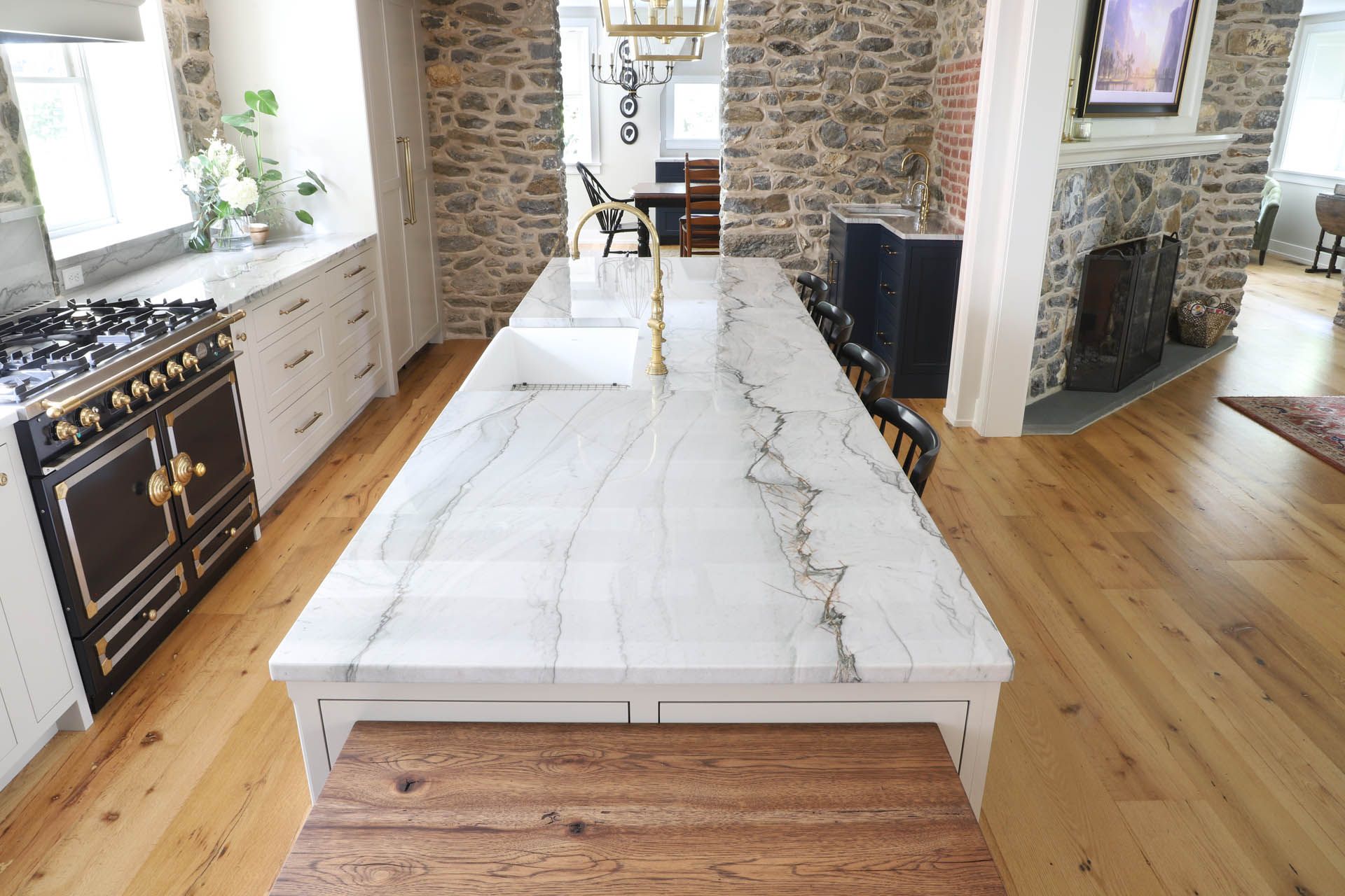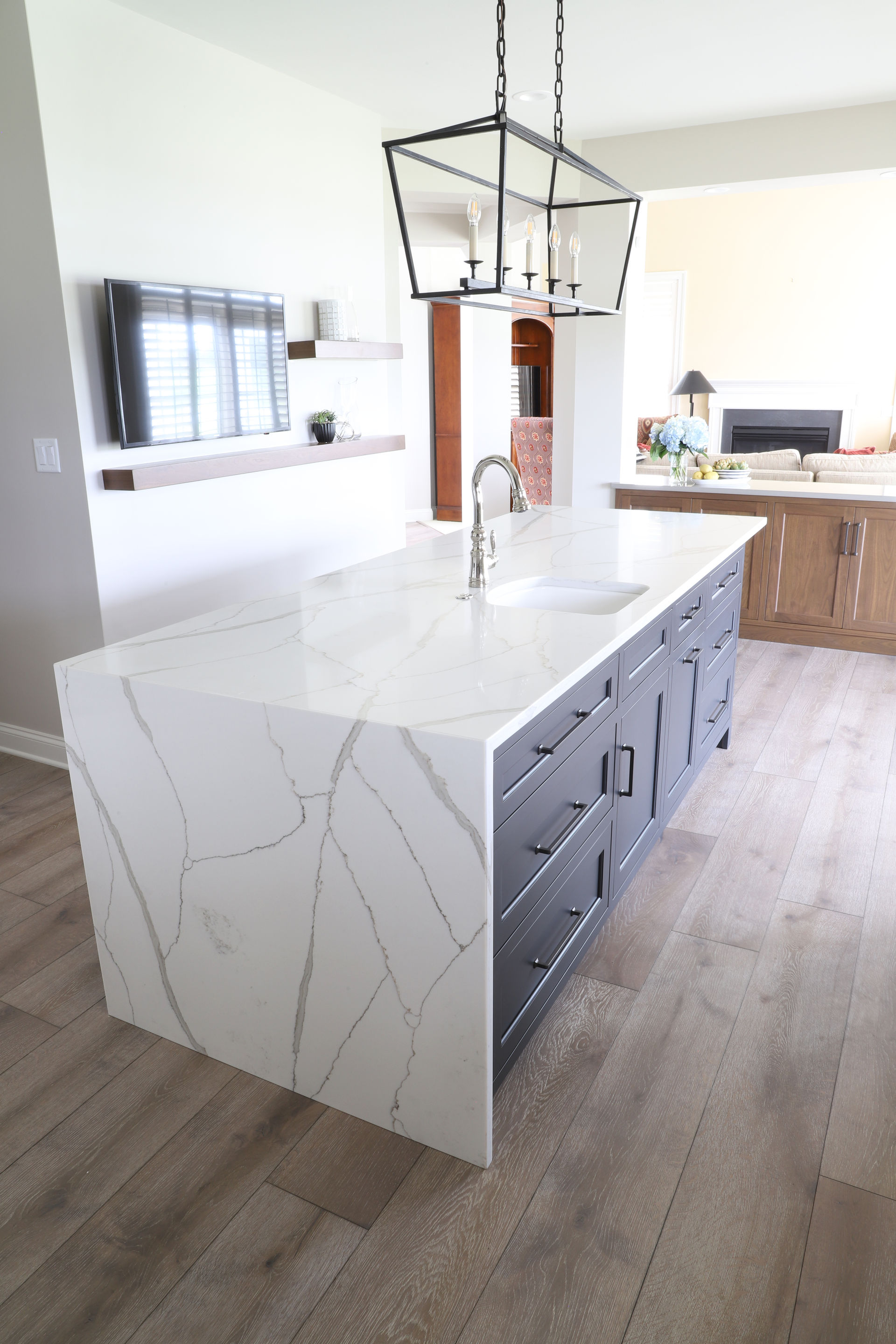 This waterfall quartz countertop is absolutely stunning. It creates a clean yet luxurious look and ties the island in with the rest of the exterior cabinetry.