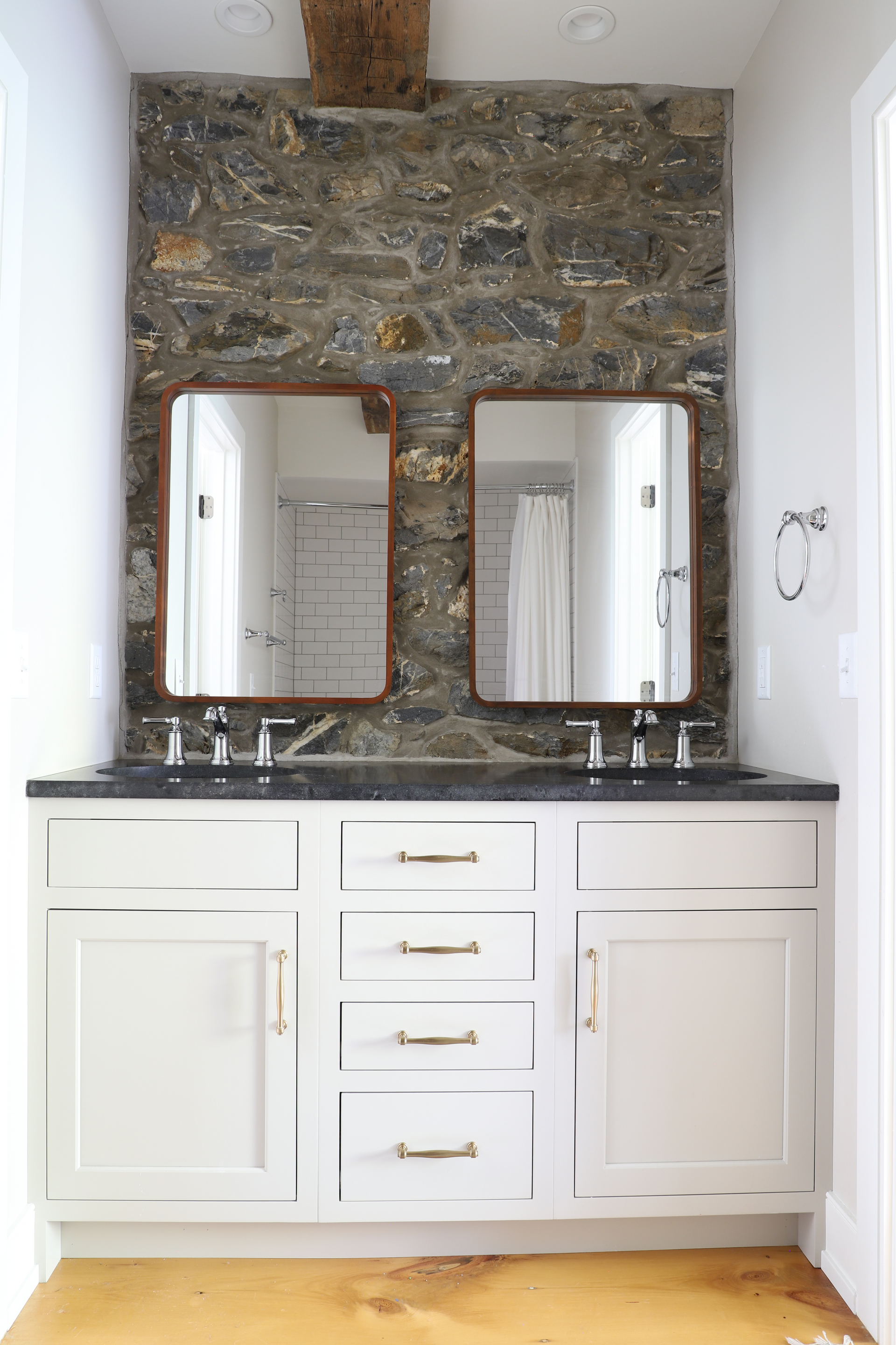 A double vanity with classic Shaker cabinetry fills one end of this bathroom. The near-perfect symmetry of this space balances its organic design with a sense of order.